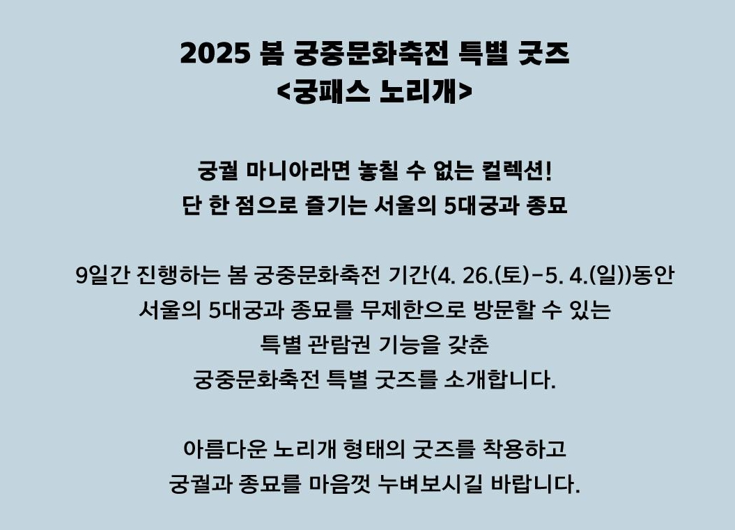 궁중문화축전의 분위기를 한층 더 빛내주는 ‘궁패스 노리개’. 그저 굿즈를 넘어서 전통의 미와 현대적 감성이 어우러진 상징이죠. 이번 봄, 고궁 나들이를 계획하고 계신다면 이 노리개와 함께 멋진 인증샷도 남기고, 특별한 추억까지 챙겨보세요. 자주 오는 기회가 아니니까요! 🎐 여러분의 봄날을 더욱 반짝이게 만들어줄 궁패스 노리개, 늦기 전에 꼭 GET 하시길 바랍니다!