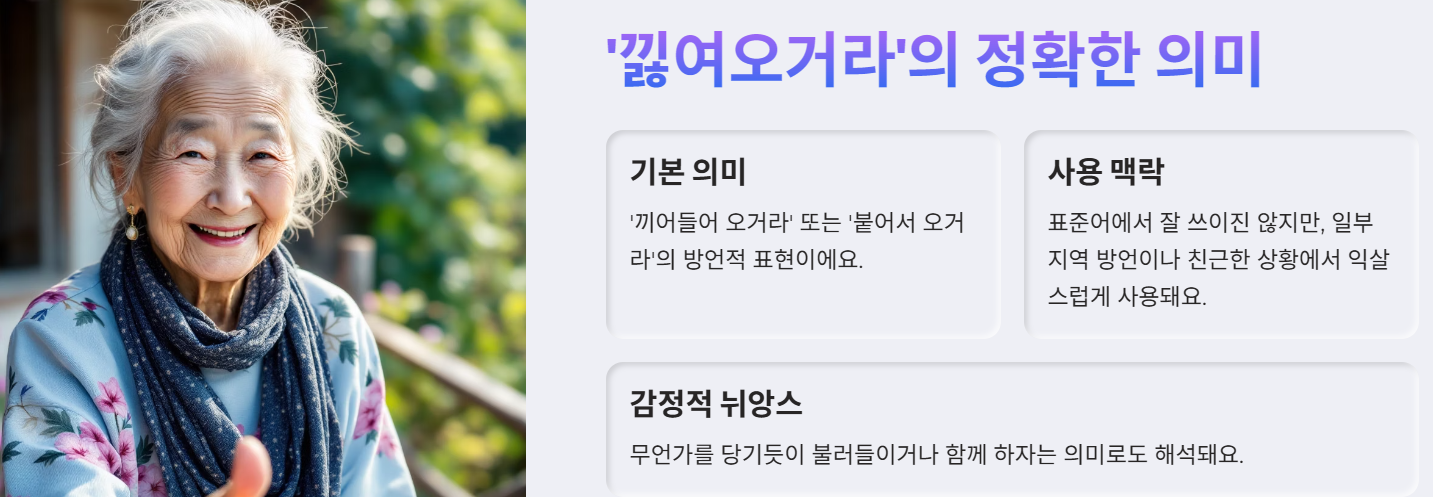 ‘낋여오거라’는 어감만 들어도 뭔가 소리치거나 부르는 느낌이 강하게 들죠? 이 표현은 사실 '끼어들어 오거라' 또는 '붙어서 오거라'의 방언적 표현이에요. 표준어에서 잘 쓰이진 않지만, 일부 지역 방언이나 친근한 상황에서 익살스럽게 사용되곤 하죠. 무언가를 당기듯이 불러들이거나 함께 하자는 의미로도 해석돼요.