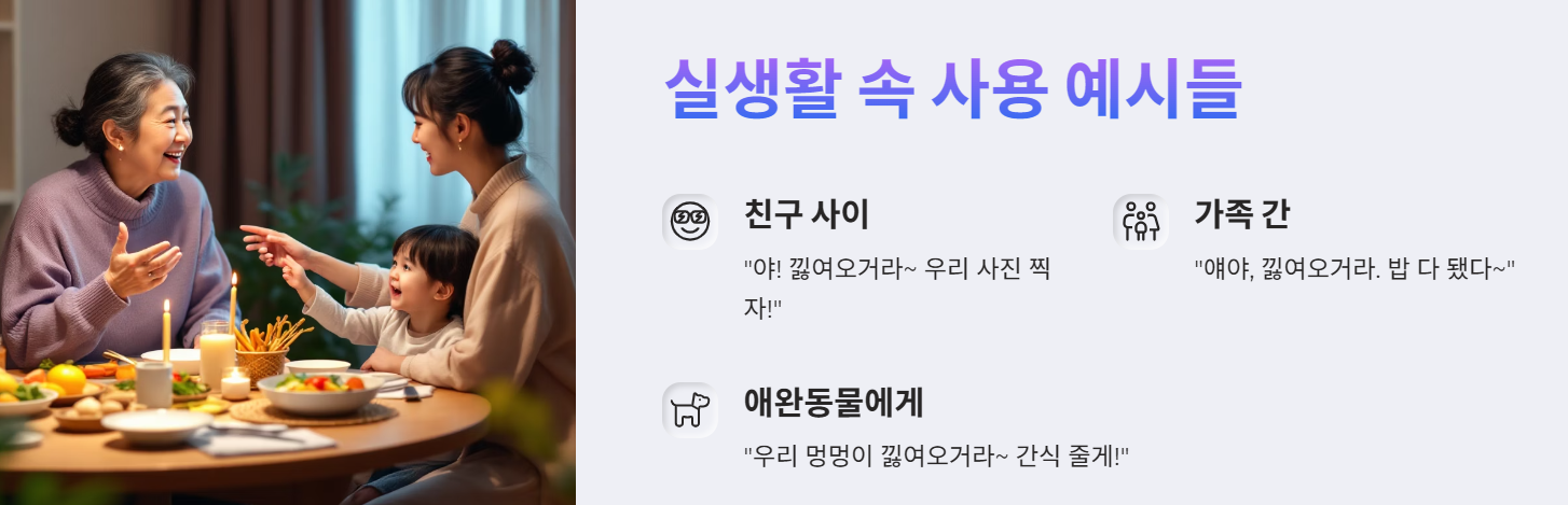 - 친구를 장난스럽게 부를 때: “야! 낋여오거라~ 우리 사진 찍자!”