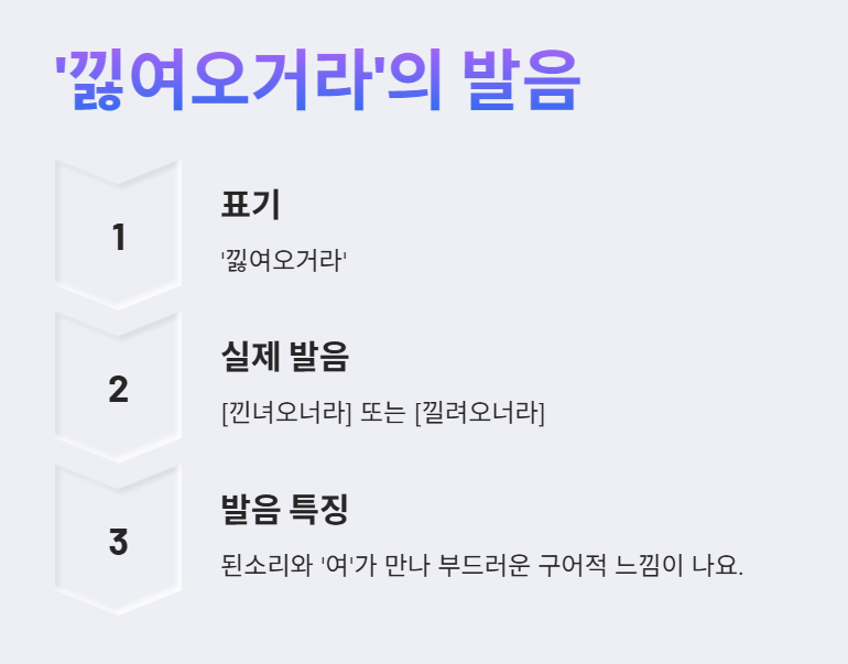 - ‘낋여’는 된소리와 이어지는 ‘여’ 때문에 실제 발음에서는 끼여 또는 낄려 처럼 발음될 수 있어요.