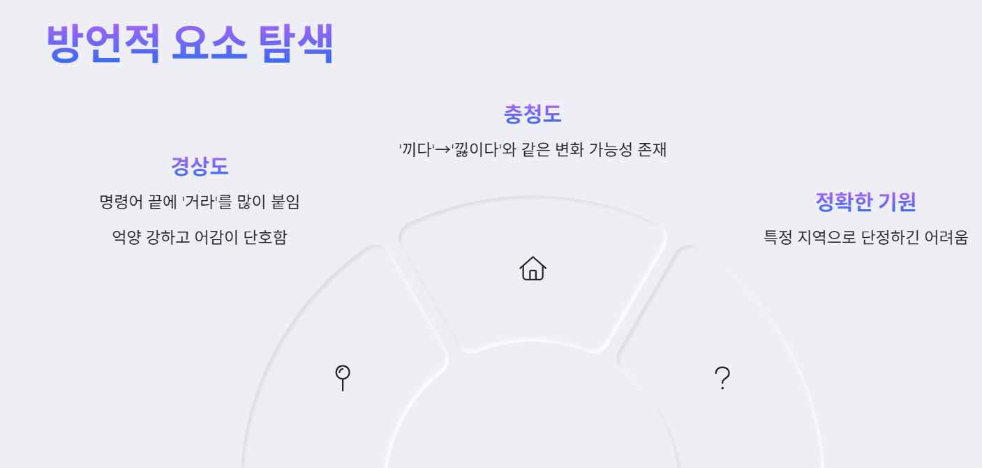 | 경상도 | 명령어 끝에 ‘거라’를 많이 붙임. 억양 강하고 어감이 단호함 |