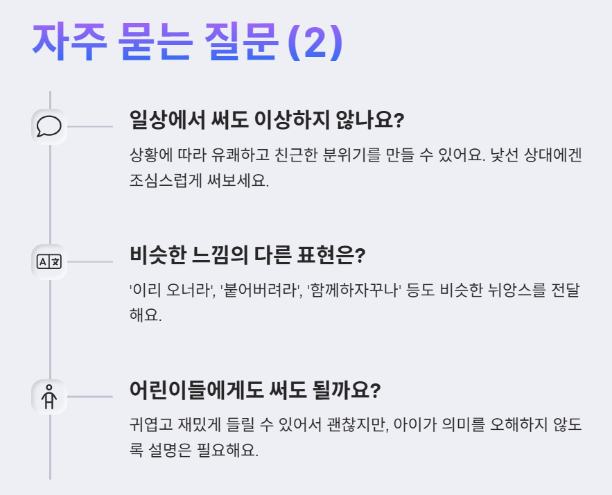 상황에 따라 유쾌하고 친근한 분위기를 만들 수 있어요. 다만, 너무 낯선 상대에겐 오해를 살 수 있으니 조심스럽게 써보세요.