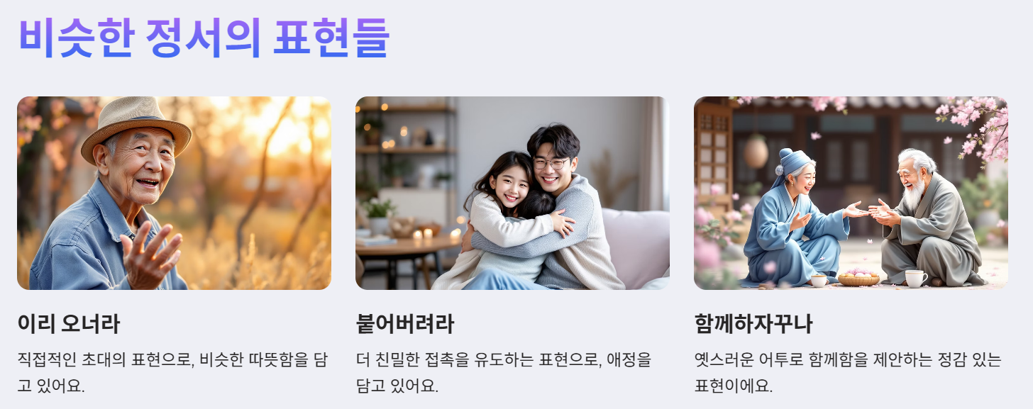 ‘이리 오너라’, ‘붙어버려라’, ‘함께하자꾸나’ 등도 비슷한 뉘앙스를 전달해요.