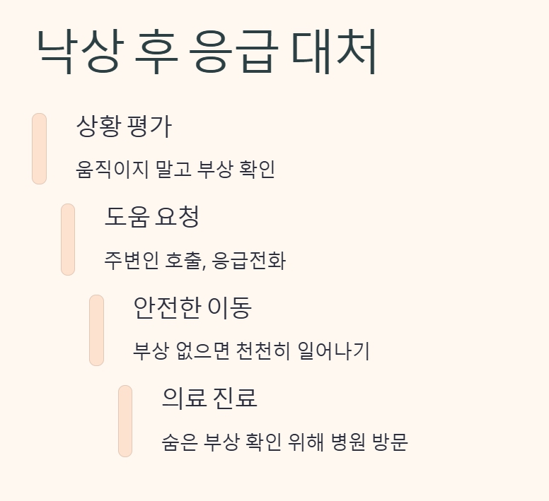 몸을 움직이지 않고 부상 여부를 확인한 뒤, 구조 요청 또는 병원 진료가 가장 우선입니다.