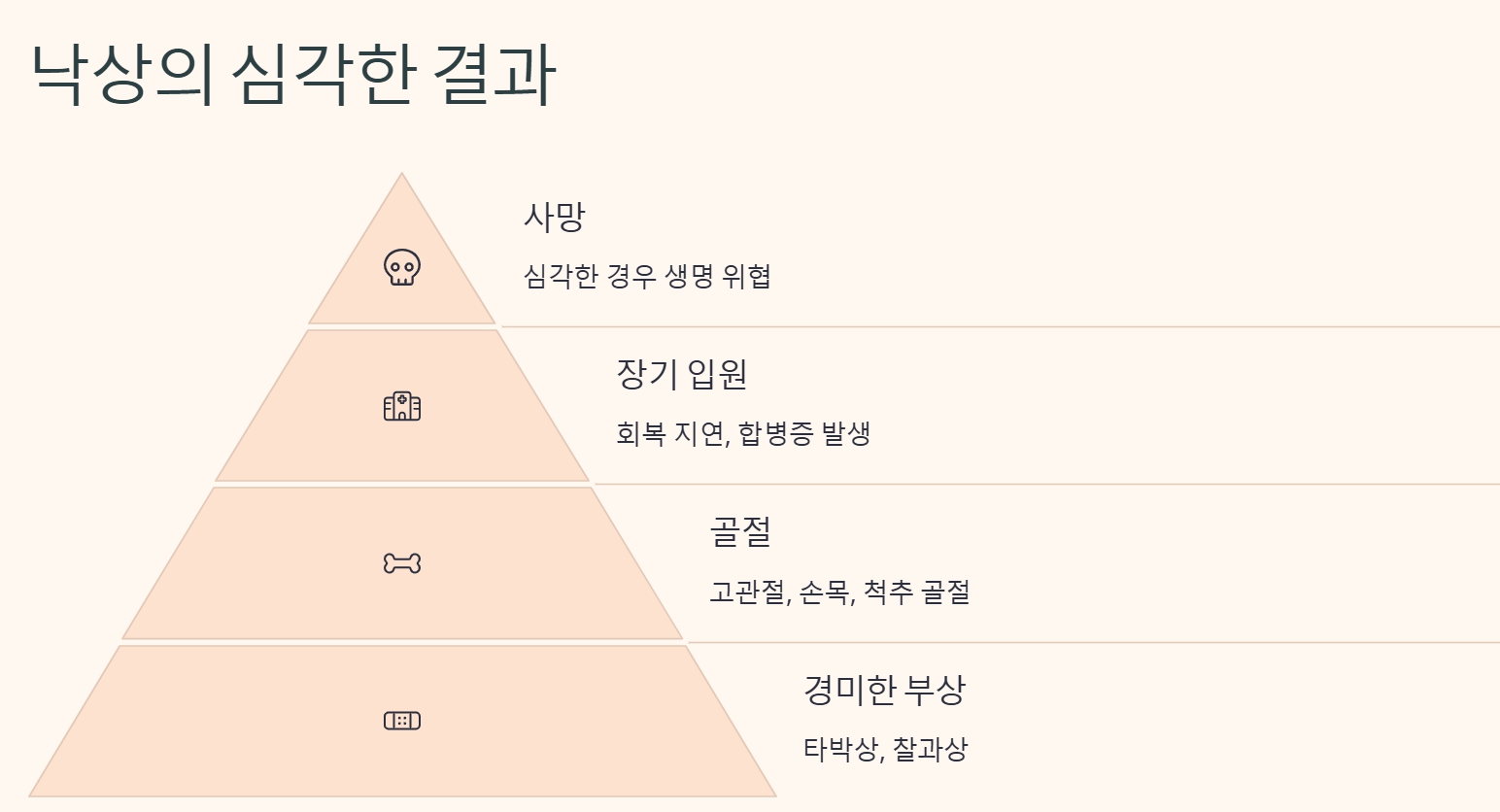 특히 노인의 경우 낙상은 골절로 이어져 장기적인 입원, 간병, 심한 경우 사망까지 초래할 수 있어요. 젊은 사람에게도 그냥 '넘어진 것'으로 끝나지 않아요. 무릎, 손목, 머리 등 중요한 부위에 부상을 남길 수 있고요, 그 순간의 충격은 꽤 오래 갈 수 있죠.