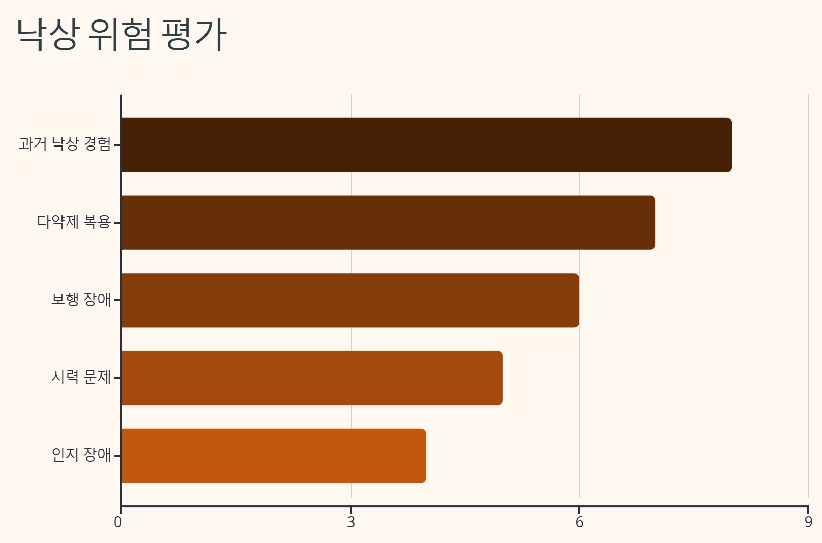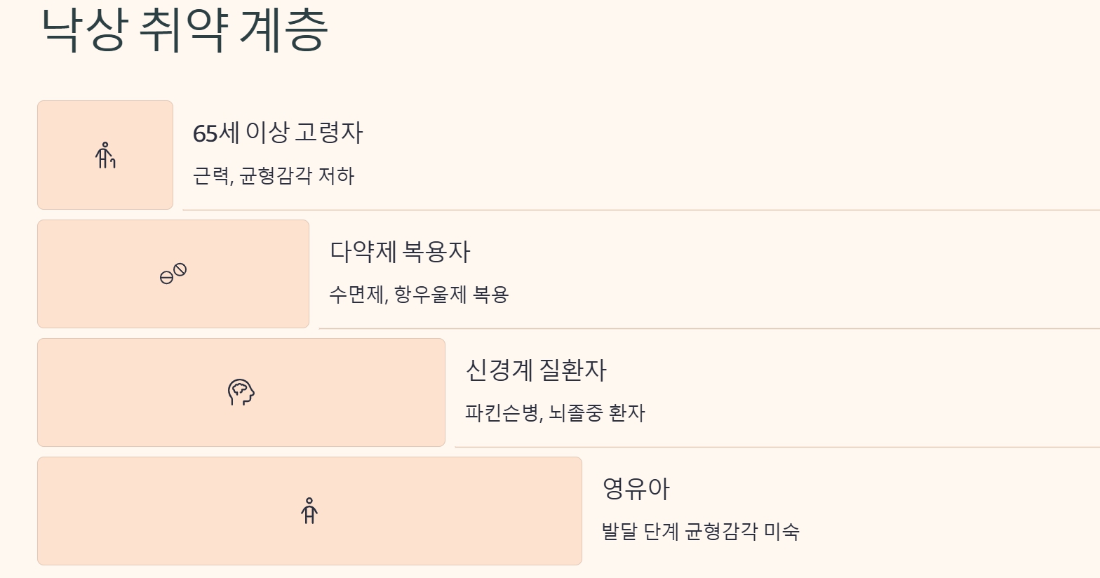 | 환경적 요인 | 젖은 바닥, 어두운 조명, 문턱, 전선 등 |