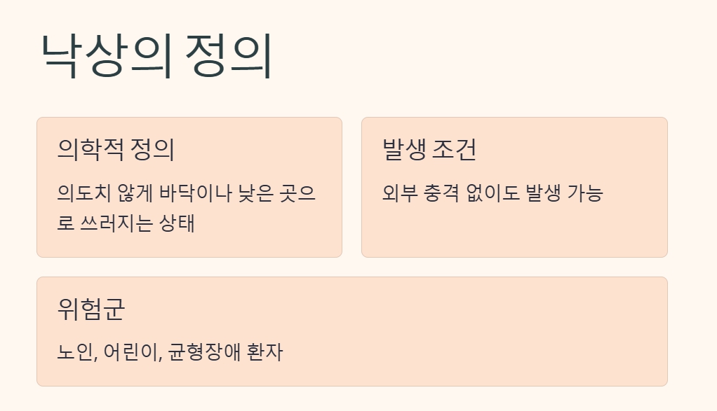 그냥 “넘어졌다”는 말이 이렇게 깊은 뜻을 가질 줄, 솔직히 상상도 못했죠? 지금부터 낙상의 진짜 의미를 알려드릴게요.