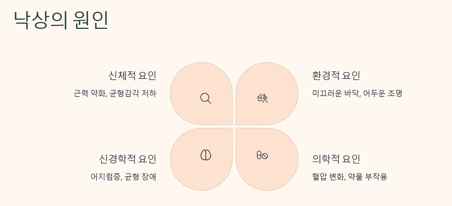 | 생리적 요인 | 근력 저하, 시력 저하, 어지럼증, 약물 부작용 |
