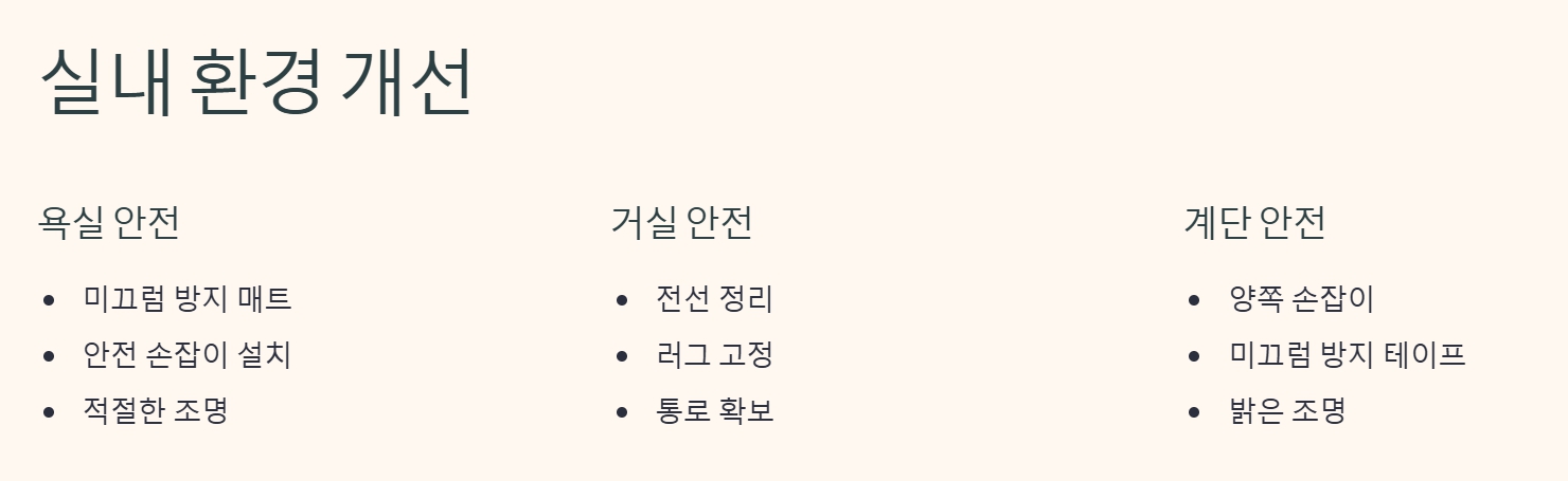 | 실내 환경 정비 | 미끄럼 방지 매트 설치, 조명 밝기 조절 등 |