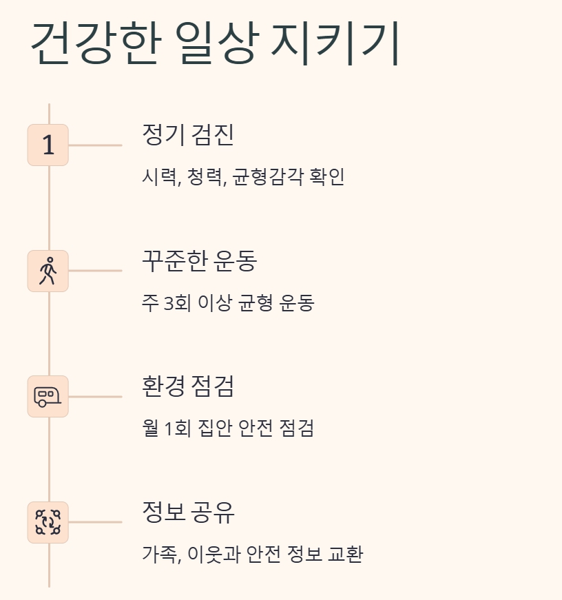 | 운동과 근력 강화 | 균형감각을 키우고 근육을 단련하여 위험을 줄임 |
