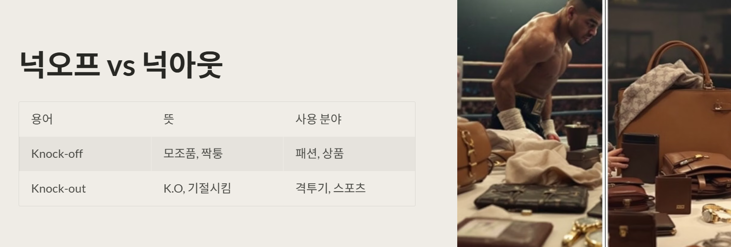 발음은 비슷하지만 의미는 완전히 달라요! ‘넉오프(knock-off)’는 복제품을 뜻하고, ‘넉아웃(knock-out)’은 격투기에서 상대를 기절시켜 승리하는 것을 말하죠. 아래 테이블을 보면서 명확하게 구분해볼게요.