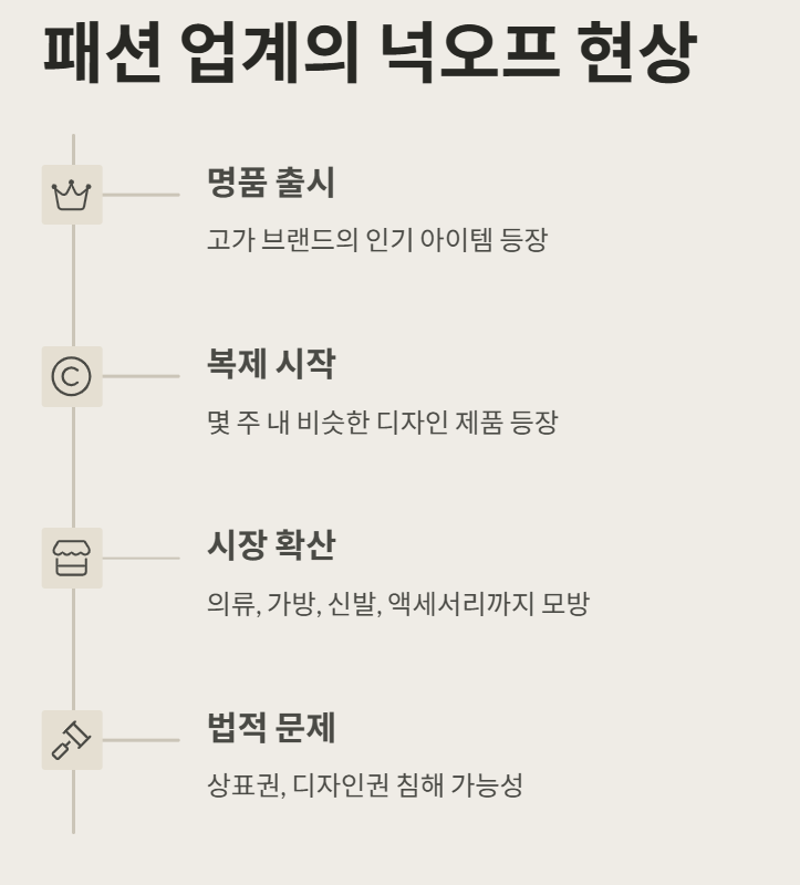 패션계에서 ‘넉오프’는 정말 뜨거운 감자예요. 고가 명품 브랜드가 내놓은 인기 아이템이 나오면, 몇 주 안 돼서 비슷한 디자인의 넉오프 제품들이 시장에 쏟아지죠. 의류뿐만 아니라, 가방, 신발, 심지어 액세서리까지 따라 만들어지곤 해요. 이건 단순히 ‘비슷한 스타일’이 아니라, 상표권이나 디자인권을 침해할 수 있는 민감한 영역이기도 해요.