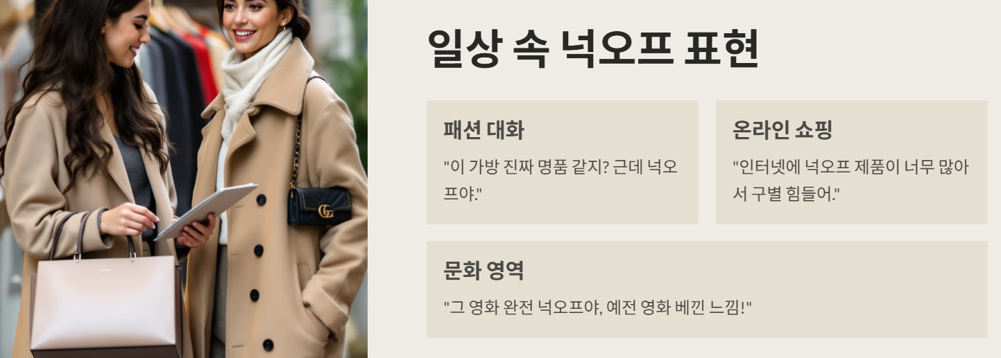 요즘은 넉오프라는 단어가 패션을 넘어 다양한 분야에서 쓰이고 있어요. 특히 친구들과 쇼핑하면서 “야, 저거 완전 넉오프다” 같은 말 자주 듣죠. 아래는 실제로 쓰이는 표현들이에요.