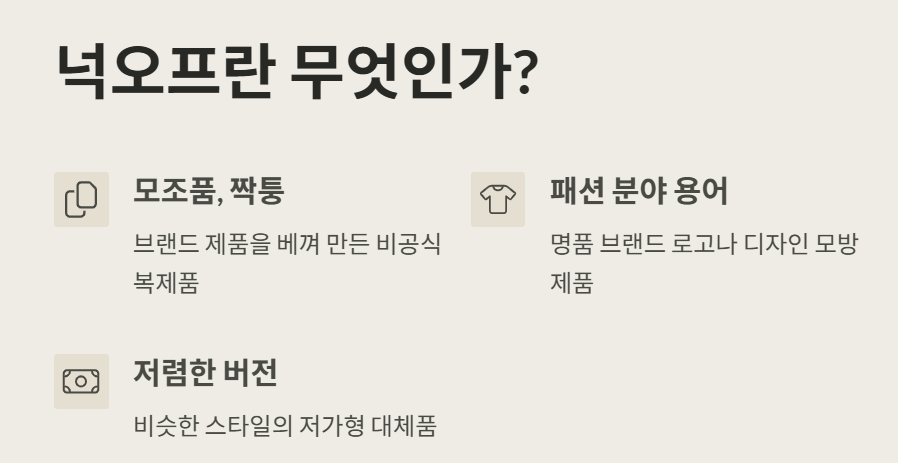 넉오프는 흔히 ‘비슷한 스타일의 저렴한 버전’을 말하지만, 카피 제품은 거의 1:1로 복제된 가짜를 의미해요. 후자가 더 불법 가능성이 높죠.