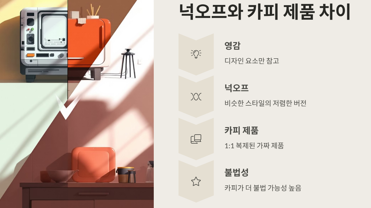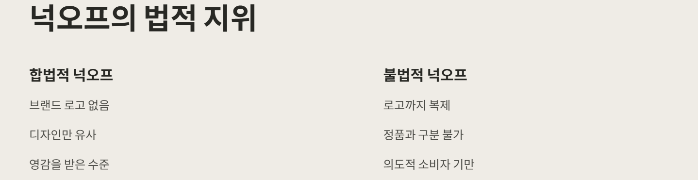 | 디자인만 유사 | 브랜드 로고 없음, 모방 디자인 | 대체로 합법 |