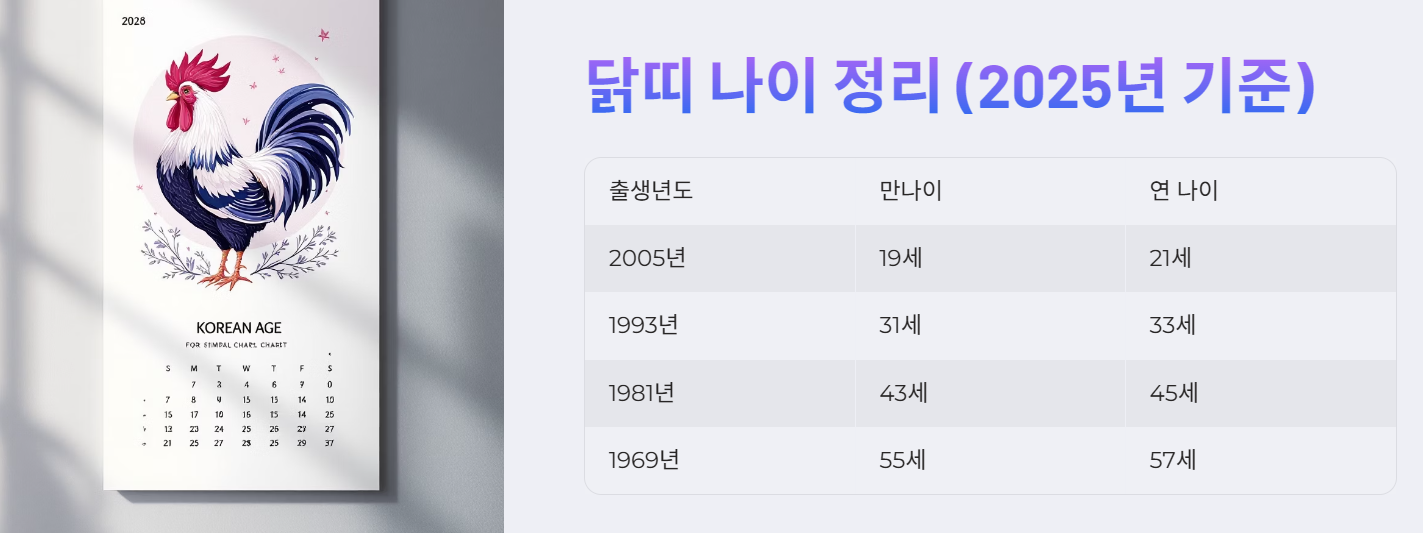 예: 1993년생 닭띠는 2025년에 만나이 31세, 연 나이로는 33세입니다.