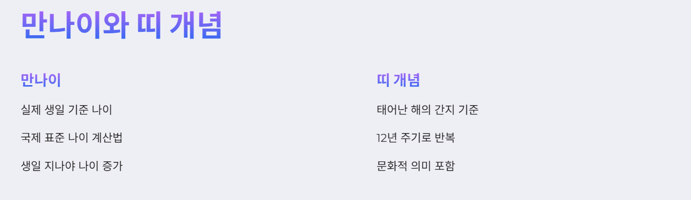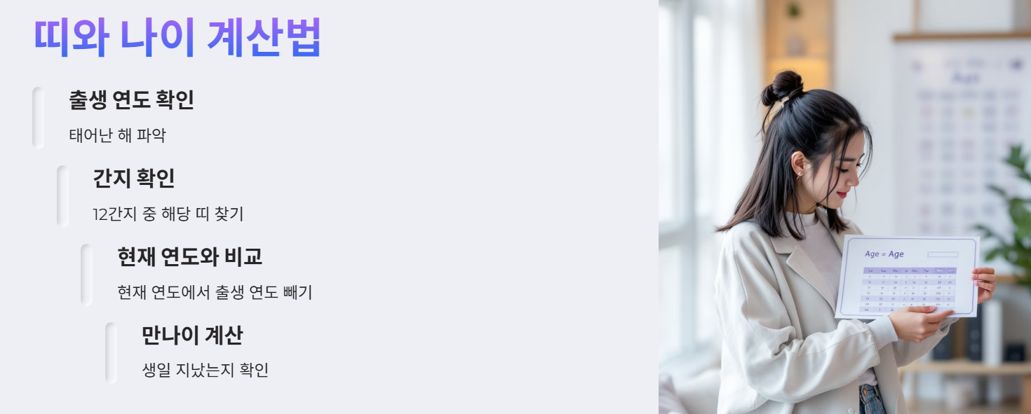 띠는 태어난 해의 간지 기준으로 정해지며, 나이는 출생 연도와 현재 연도를 비교해 계산합니다.
