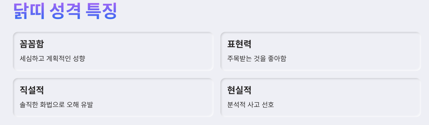 닭띠는 동물의 특징처럼, 또렷하고 정확한 성격을 지닌 경우가 많다고 알려져 있어요. 사람에 따라 다르지만, 전통적으로 닭띠 사람들의 성향은 아래와 같이 요약할 수 있답니다.