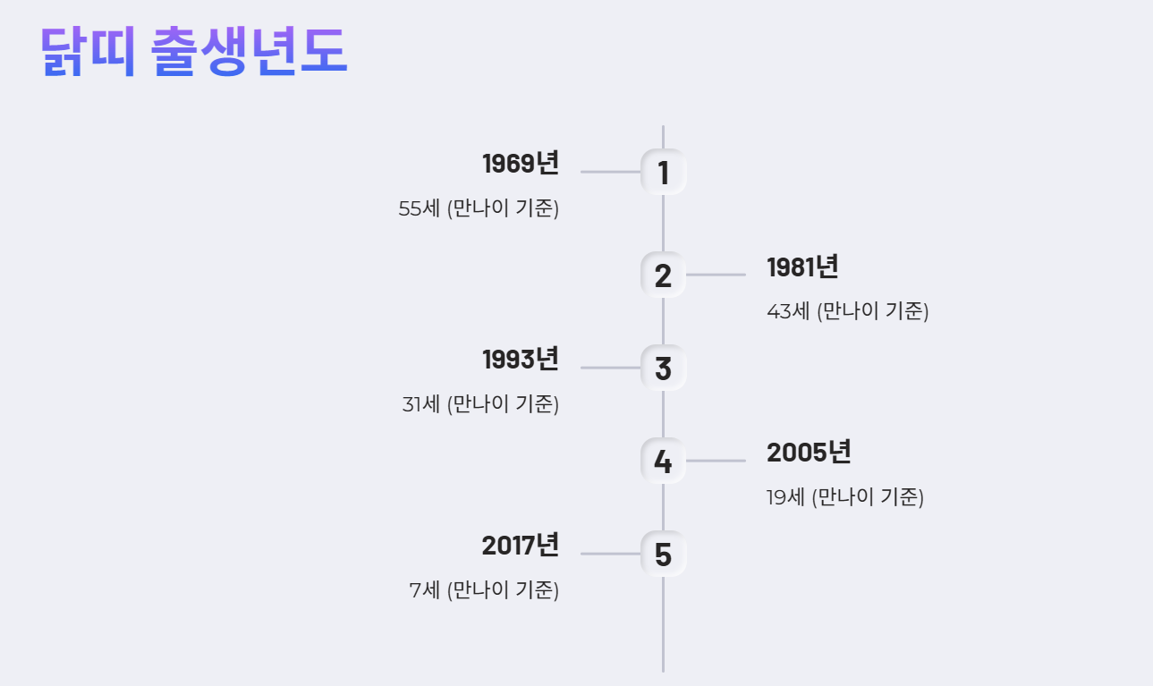 안녕하세요, 요즘 '만나이'가 공식화되면서 제 주변에도 나이 계산 때문에 혼란스러워하는 분들이 꽤 많더라고요. 특히 띠로 나이를 계산하던 분들은 더 헷갈릴 수밖에 없죠. 저도 친구랑 이야기하다가 "우리 동갑인데 닭띠 아니었어?"라는 말에 갸웃했던 기억이 나요. 이참에 닭띠의 해가 언제인지, 지금 몇 살인지, 또 닭띠가 가진 의미까지 제대로 정리해보면 어떨까 싶어서 글을 준비했어요.