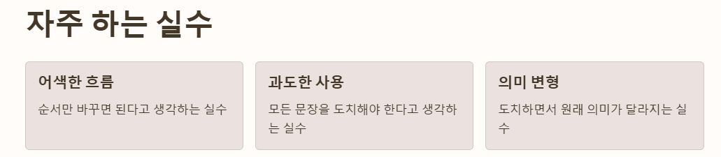 도치법을 처음 배우다 보면 순서만 바꾸면 되는 줄 알고 문장의 흐름이 어색해지는 경우가 있어요. 또 어떤 친구들은 꼭 도치해야만 예쁜 문장이라고 생각하는데, 꼭 그런 건 아니에요. 아래는 자주 나오는 실수와 해결법을 정리한 표예요.