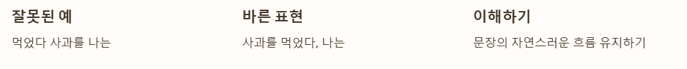 | 먹었다 사과를 나는 (문장 흐름이 이상함) | 사과를 먹었다, 나는. |