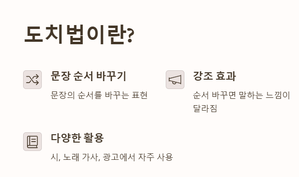 도치법은 주로 문장의 어떤 부분을 강조하거나 리듬감을 살리기 위해 사용돼요. 글이나 말이 더 살아나게 해주죠! 아래 표를 보면 도치법을 쓰는 목적이 더 잘 이해될 거예요.