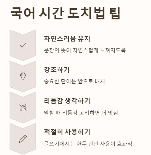 도치법을 국어 시간에 멋지게 활용하려면 아래 팁들을 참고해보세요! 발표나 글쓰기에서 인상 깊은 표현으로 사용할 수 있어요.