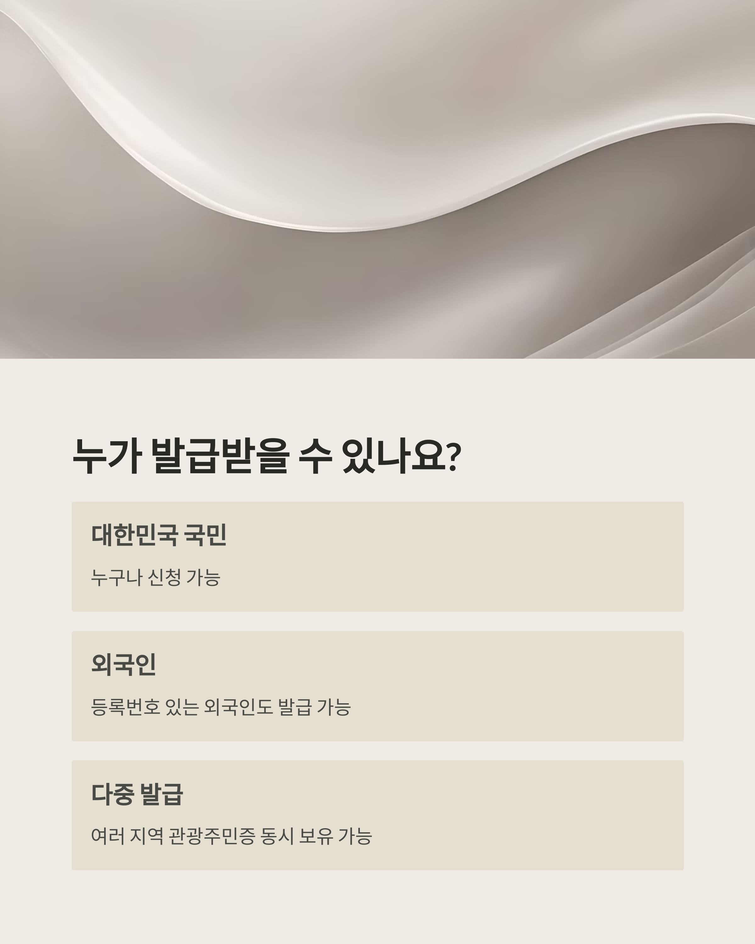 - 지역 제한 없음, 한 사람이 여러 지역 관광주민증 보유 가능