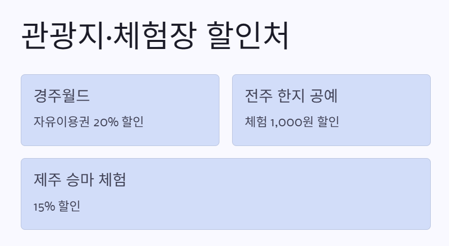 ‘어디 가면 뭐 하지?’ 고민될 때, 관광지 할인은 정말 꿀이죠. 주요 관광지뿐 아니라 체험형 콘텐츠도 다수 포함되어 있어서 가족 단위 여행객에게 특히 인기가 많아요.