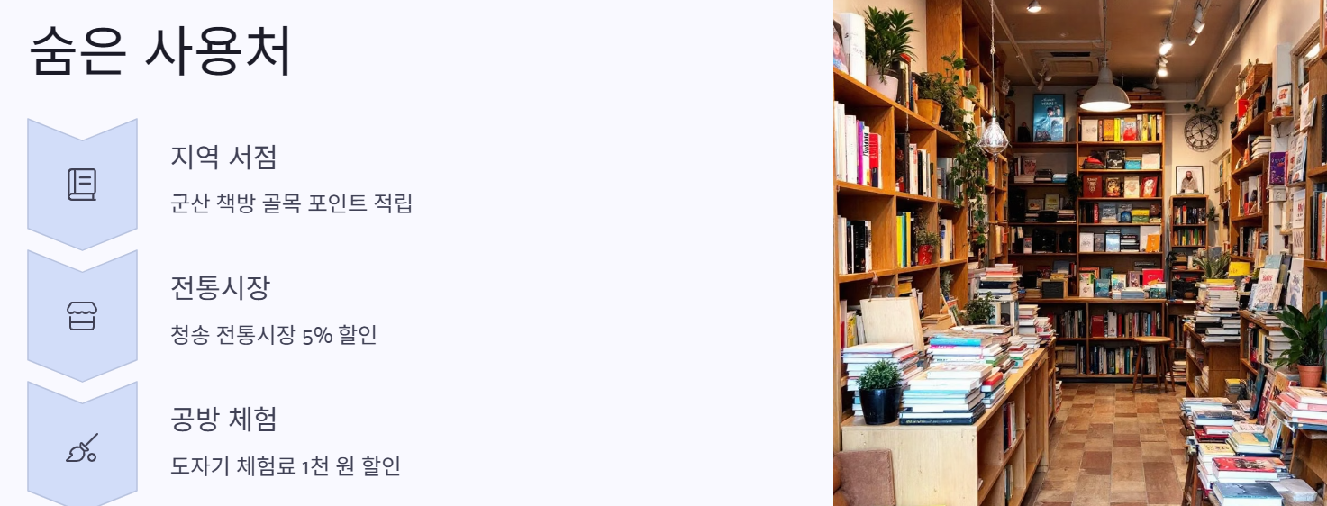 생각보다 잘 알려지지 않은 숨은 명소나 혜택도 많아요. 특히 지역서점, 지역작가 굿즈숍, 전통시장 등에서도 혜택이 적용되는데요, 이런 곳은 분위기까지 더해져서 여행의 퀄리티를 한층 높여준답니다.