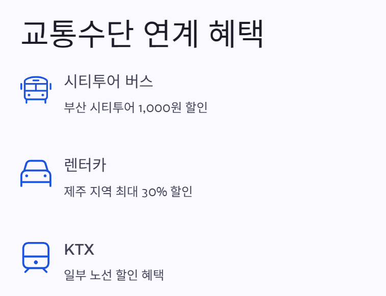 교통도 챙겨주는 디지털 관광주민증! 지역 내 시티투어 버스, 렌터카, 일부 KTX 노선과도 제휴되어 있어서 이동 비용까지 줄일 수 있어요. 여행의 시작과 끝을 책임지는 교통비까지 아껴준다면? 완전 이득이죠!