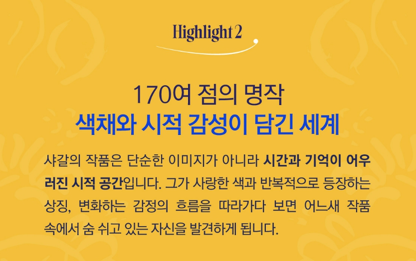 샤갈 전시는 단순한 회화 감상이 아니에요. 그의 인생과 내면 세계를 따라가다 보면, 그림 속 장면이 어느새 내 이야기처럼 다가오는 경험을 하게 되거든요. 게다가 이번 전시는 몰입형 전시까지 포함되어 있어서 마치 그림 속을 직접 걷는 듯한 체험도 가능해요.