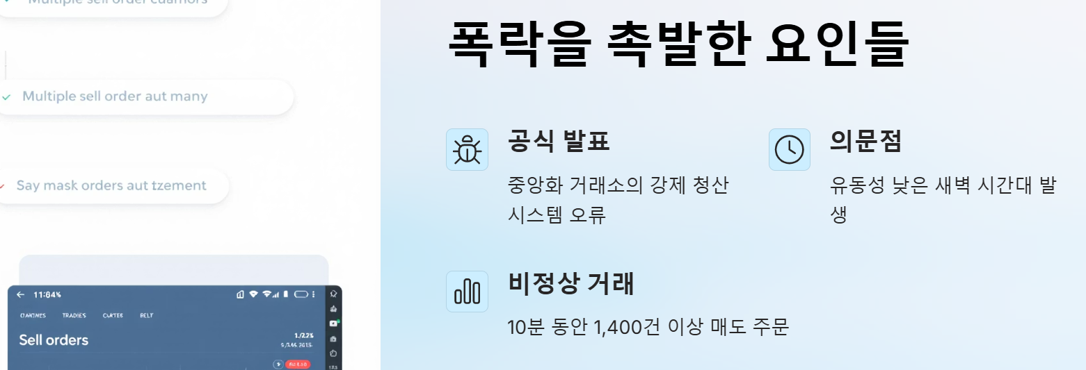 공식적으로는 "중앙화 거래소의 강제 청산 시스템 오류"가 원인이라고 밝혔지만, 많은 투자자들은 이 말에 고개를 갸웃합니다. 왜 하필 유동성이 가장 낮은 새벽 시간이었을까요? 알고리즘 오류인지, 해킹인지, 혹은 조작이었는지는 여전히 불분명합니다. 단 10분 동안 1,400건이 넘는 매도 주문이 터져 나왔다는 사실만 봐도 이건 단순한 우연이라기엔 무리가 있어요.
