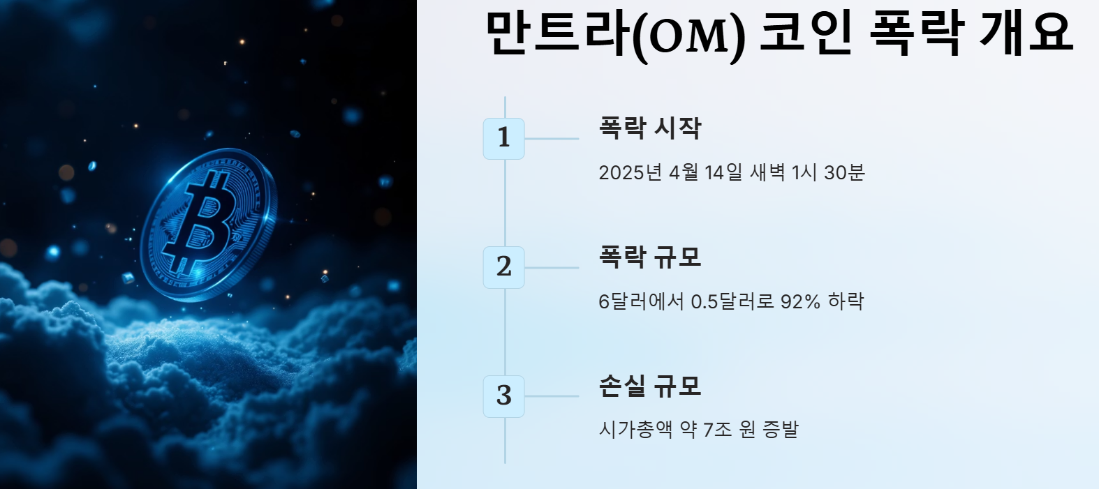 2025년 4월 14일 새벽 1시 30분, 만트라(OM) 코인은 아무런 예고 없이 무너졌습니다. 6달러를 오가던 이 대형 프로젝트는 3시간 반 만에 0.5달러대로 추락하면서 약 92%의 하락률을 기록했죠. 이 한밤중의 추락은 시가총액 기준 약 7조 원이 증발한 어마어마한 사건이었습니다.