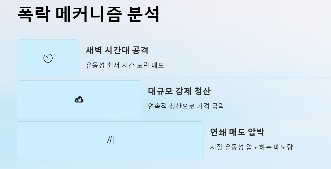 새벽 시간대, 대규모 강제 청산이 연속적으로 발생하면서 시장의 유동성을 압도했고, 이로 인해 연쇄적인 매도 압박이 폭락으로 이어졌습니다.