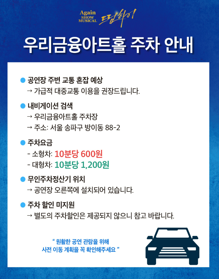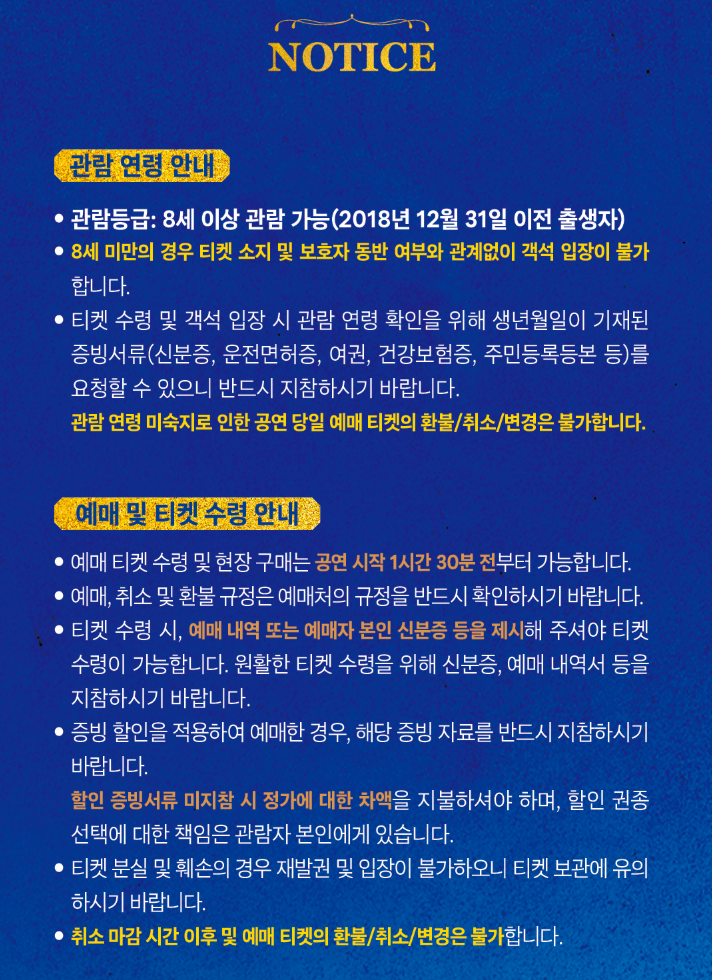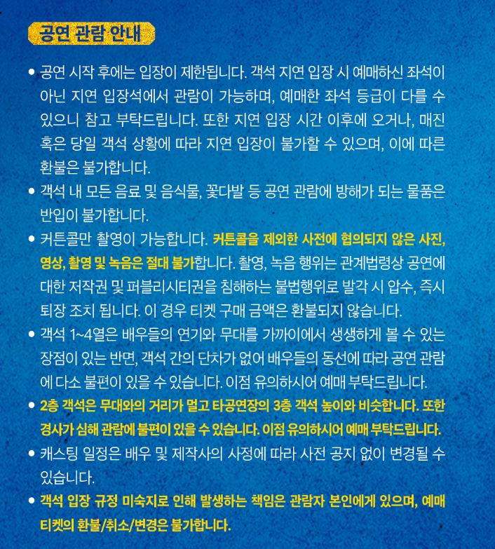 | 공연 시간 | 화·목·금: 19:30 / 수: 15:00, 19:30 / 주말·공휴일: 14:00, 18:30 |
