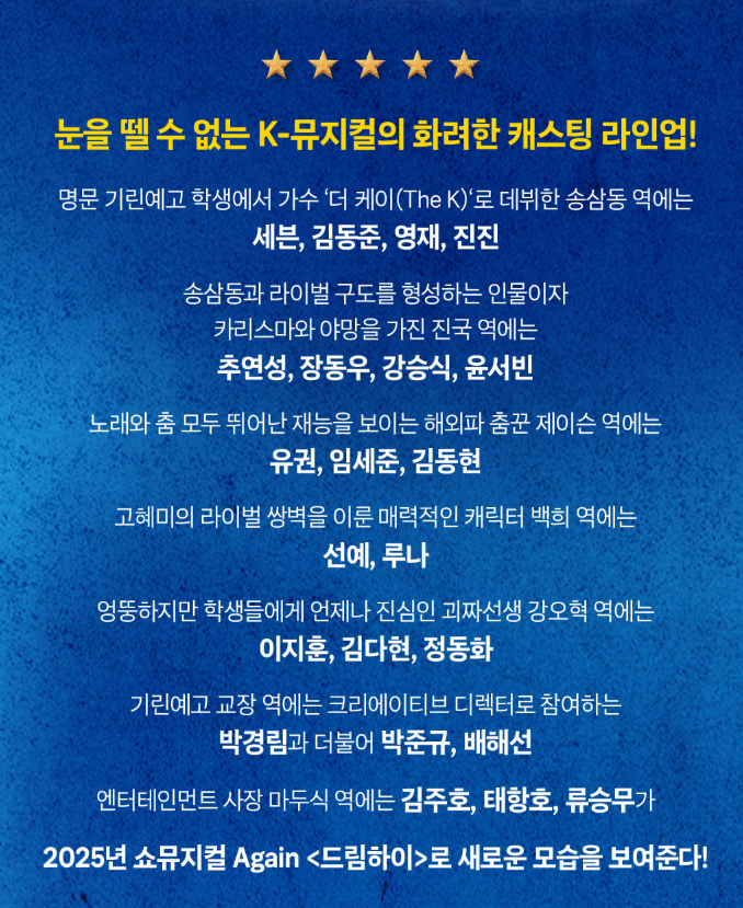 안녕하세요, 여러분! 육아와 바쁜 일상에 치이던 어느 날 밤, 우연히 재방송으로 만났던 그 드라마 '드림하이' 기억하시나요? 저에겐 그 드라마가 큰 위로였고, 몰입해서 웃고 울던 시간이 아직도 생생해요. 그리고 놀랍게도, 그 감동이 다시 돌아왔답니다. 바로 쇼뮤지컬 Again 드림하이라는 이름으로요! 2023년 초연에서 많은 사랑을 받았던 이 작품이, 2025년 4월 한국과 일본에서 동시 개막된다는 소식에 설렘이 가득해졌어요. 출연진도, 무대 구성도, 팬들의 반응도 모두가 기대 이상이라는데요. 과연 어떤 이야기로 우리의 추억을 다시 일깨워줄지, 지금부터 함께 들여다봐요!