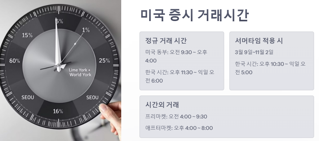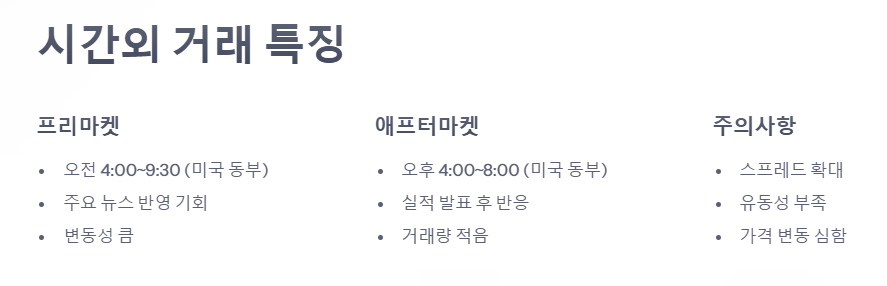 - 프리마켓: 오전 4시 ~ 9시 30분 / 애프터마켓: 오후 4시 ~ 8시 (미국 동부 기준)