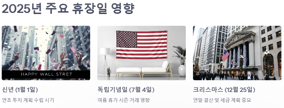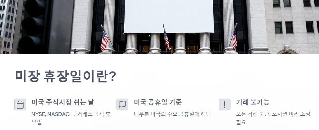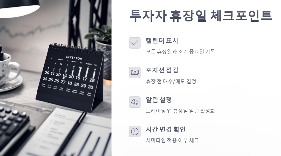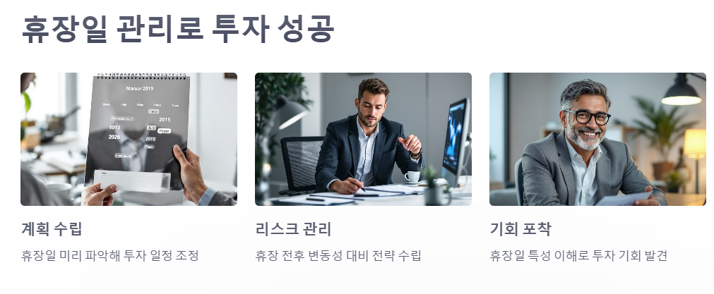 | 휴장일 미리 파악 | 매수·매도 계획을 세울 때 꼭 확인해서 낭패 방지 |