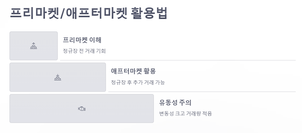 | 프리/애프터마켓 활용 | 변동성 크지만 기회를 노릴 수 있는 전략 구사 |