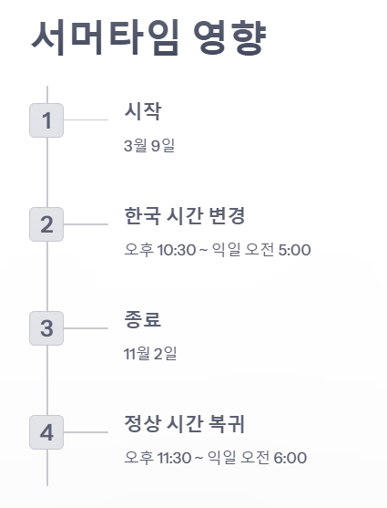 - 서머타임 기간(3월 9일~11월 2일): 오후 10시 30분 ~ 익일 오전 5시