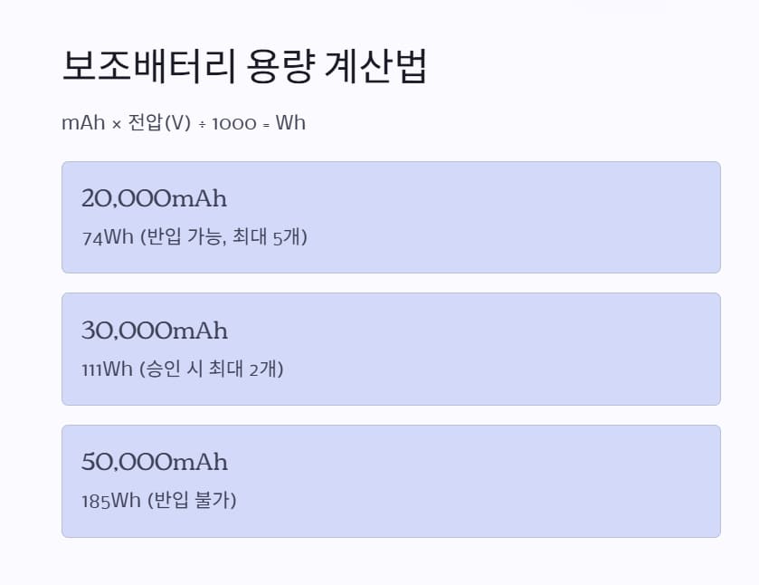 - 20,000mAh × 3.7V ÷ 1000 = 74Wh → 반입 가능, 최대 5개까지