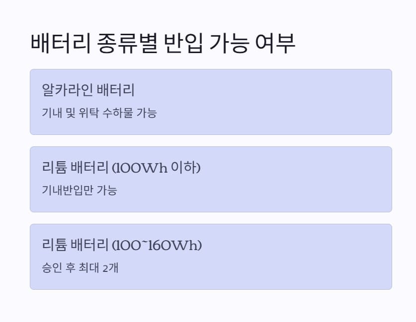 | 리튬 배터리 | 100Wh 이하 | ✅ 기내반입 가능 | 스마트폰 보조배터리 등 |