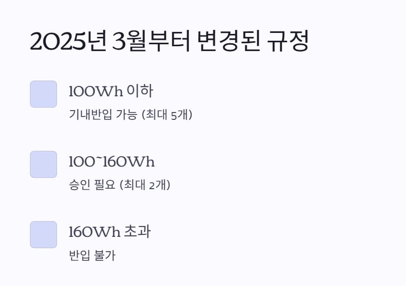 | 리튬 배터리 | 100~160Wh | ✅ 최대 2개 가능 (승인 必) | 노트북/태블릿용 |