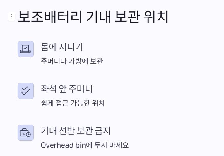 - 탑승 시 보조배터리는 직접 지참 또는 앞주머니 보관