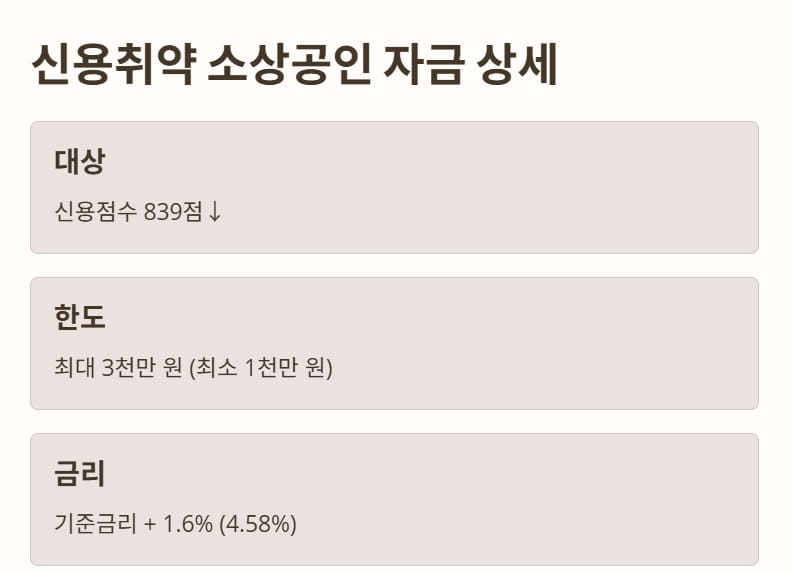 | 신용취약 소상공인 자금 | 신용점수 839점↓ | 최대 3천만 원 | 기준금리 + 1.6% | 동일 |