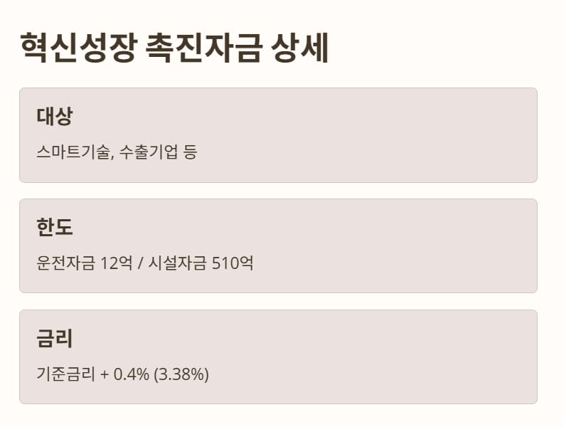 | 혁신성장 촉진자금 | 스마트기술, 수출기업 등 | 운전자금 1 |
