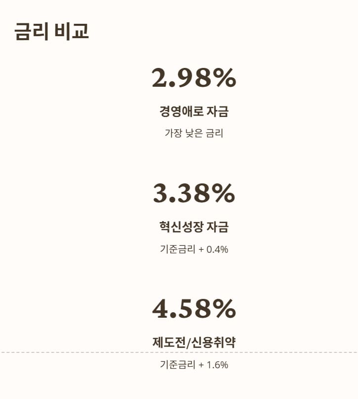 - 정책자금 기준 금리(2025년 1분기 기준): 2.98%