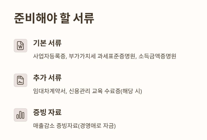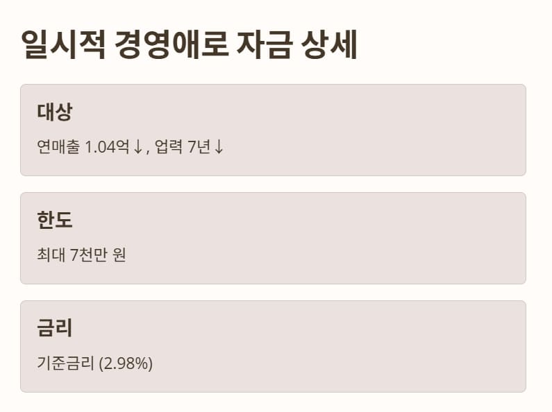 | 일시적 경영애로 자금 | 연매출 1.04억↓, 업력 7년↓ | 최대 7천만 원 | 기준금리 | 동일 |