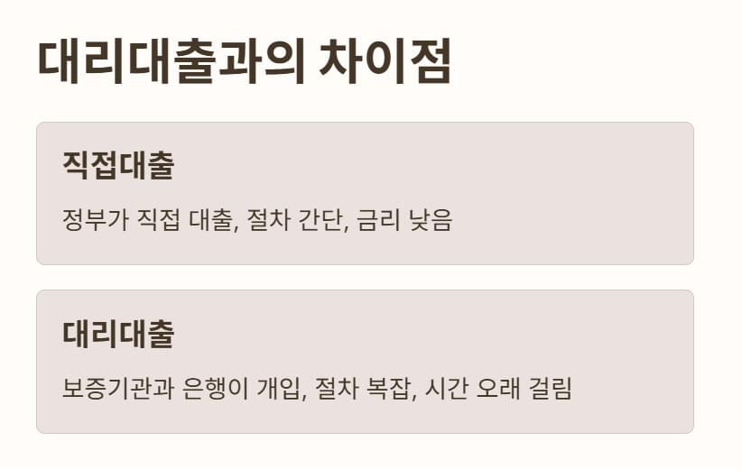 반면, 대리대출은 보증기관과 은행이 중간에 개입하여 절차가 복잡하고 시간도 오래 걸립니다.
